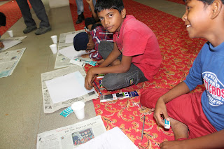 ]the kids painted their hearts out for an hour. Amongst giggles and laughter, the kids gave wings to their imagination- the simple act of being at liberty to express themselves, bringing wide smiles to their beautiful faces at Tagore theatre.